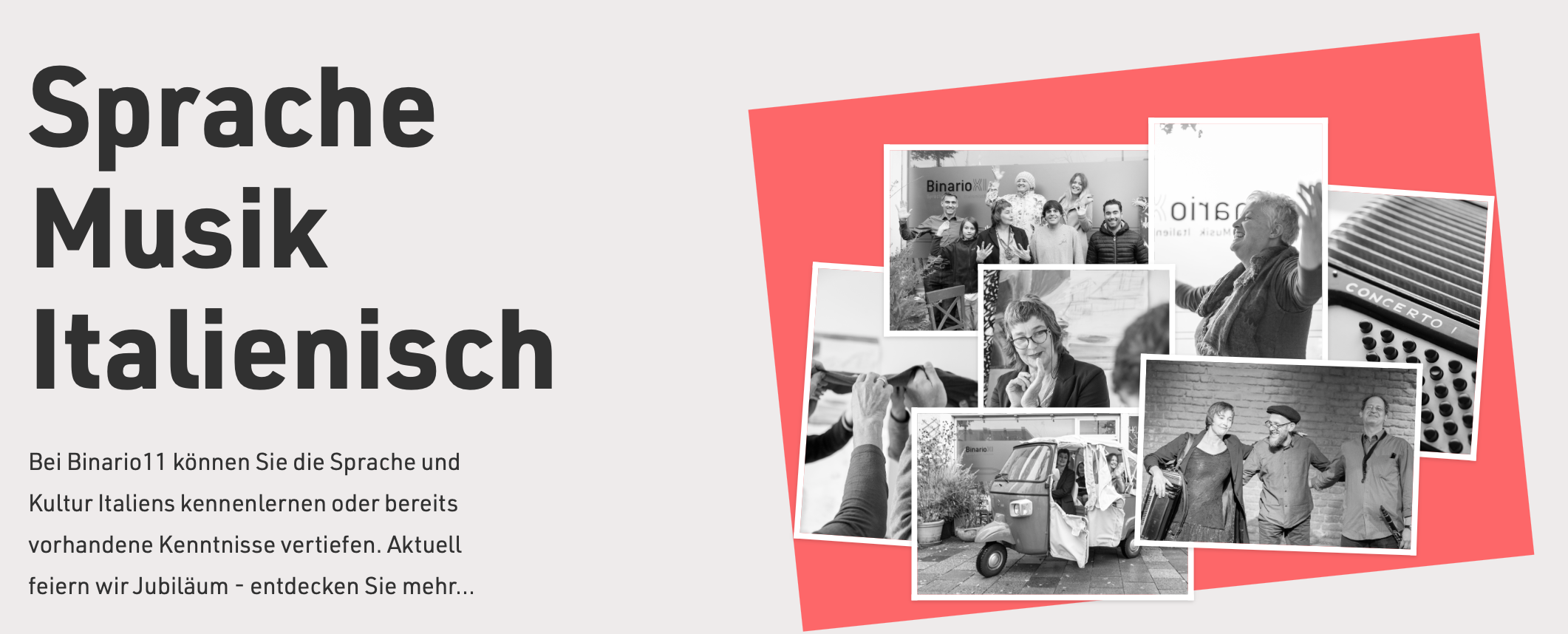 Babara Wolf versteht sich als eine Mittlerin zwischen der italienischen und der deutschen Kultur. Ihr Unternehmen binario11 bietet vielfältige Angebote für Sprache, Musik und Italienisch. Im Februar 2021 startete die neue Website von binario11. menzing.photography wurde mit einem Fotoshooting beauftragt.