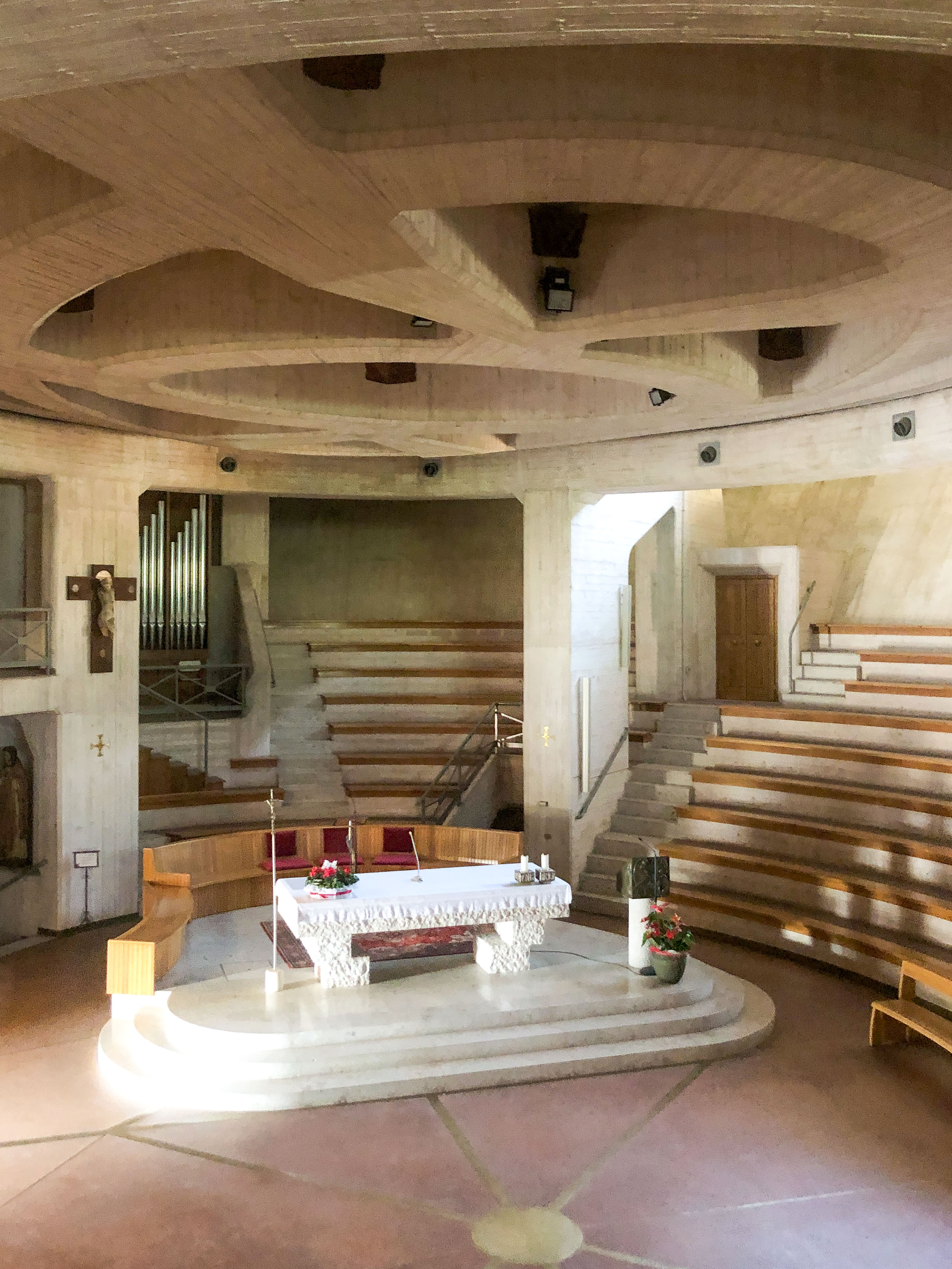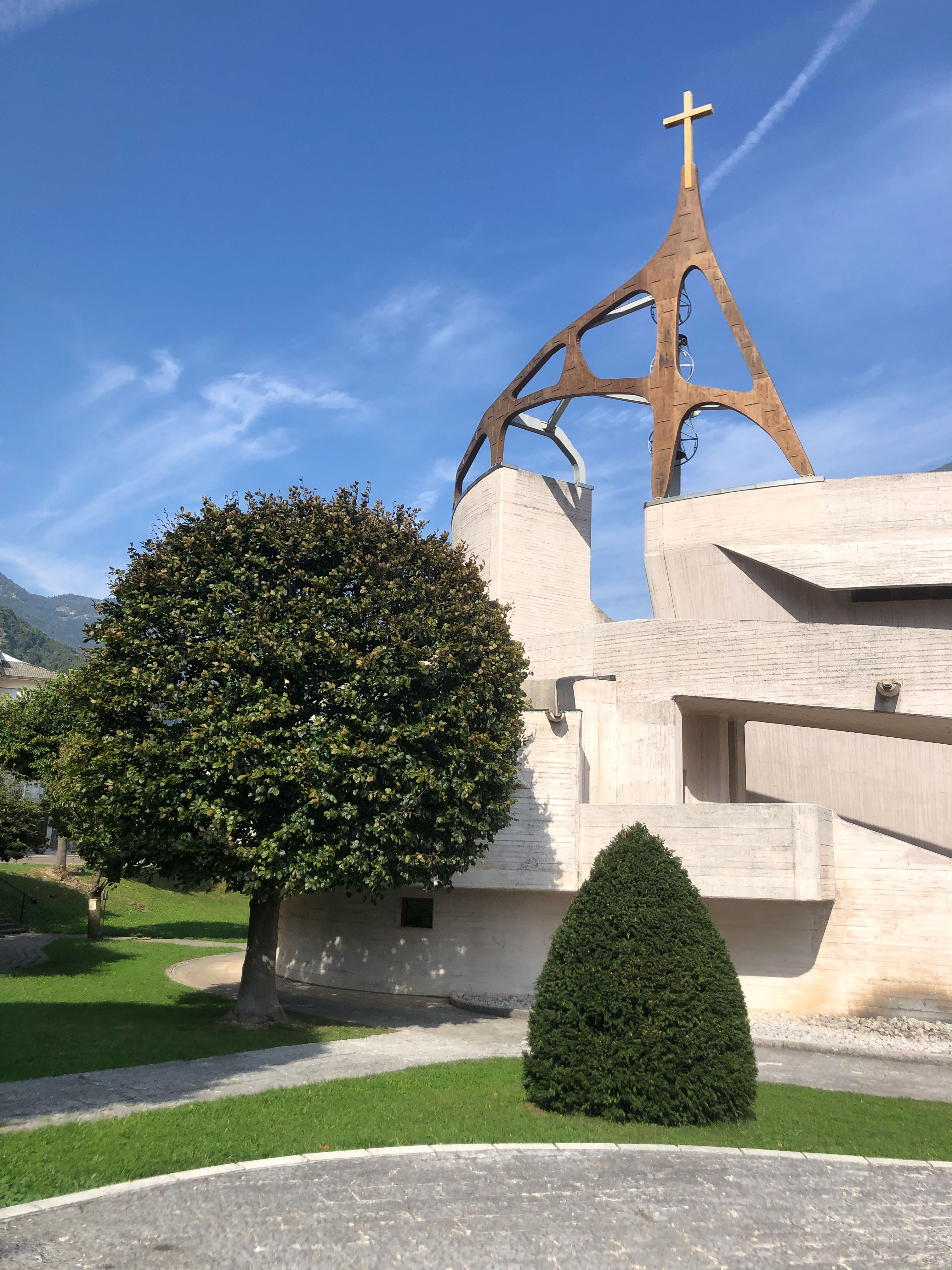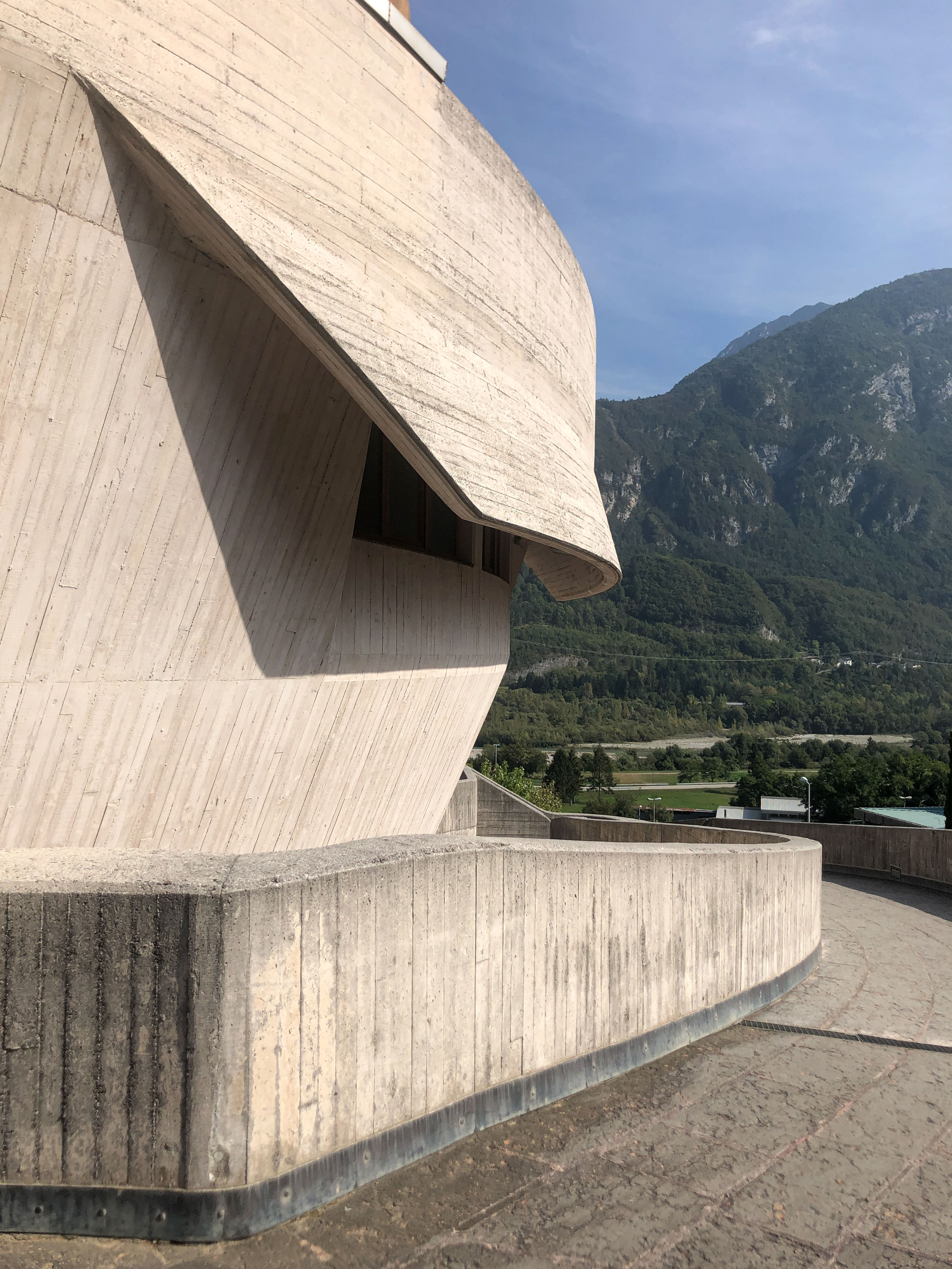 Die Kirche Santa Maria Immacolata, besser bekannt als Denkmalskirche von Longarone, wurde zu Ehren der Opfer der Erdrutsch-Katastrophe von Longarone vom 09.10.1963 nach einem Entwurf des italienischen Architekten Giovanni Michelucci errichtet. Das Stahlbetonbauwerk hat eine elliptische Form und bildet zwei übereinanderliegende Amphitheater. Das untere ist überdacht und umfasst den Altar und den für die Gläubigen reservierten Bereich, das obere liegt unter freiem Himmel und wird für Sonderveranstaltungen genutzt. Longarone, 2023