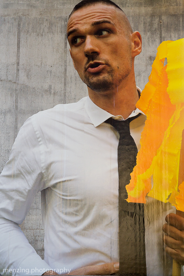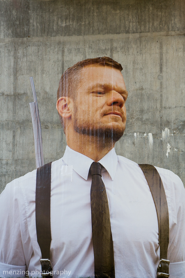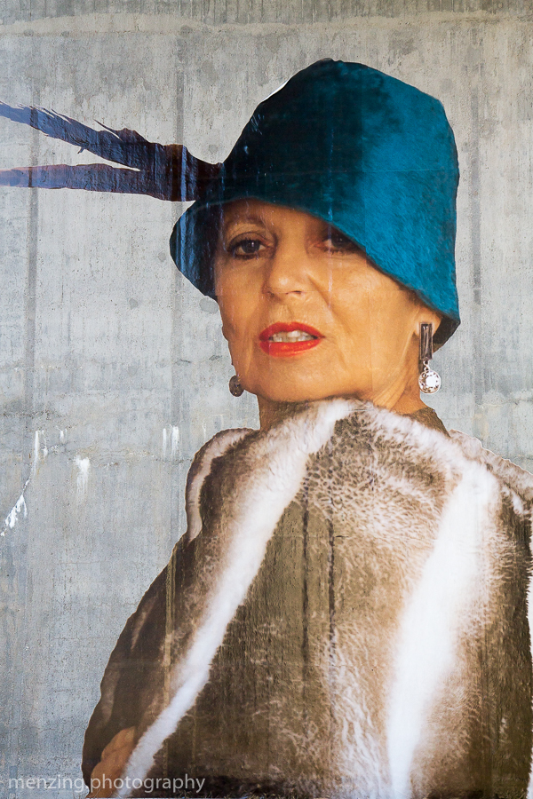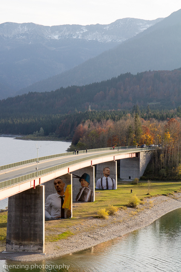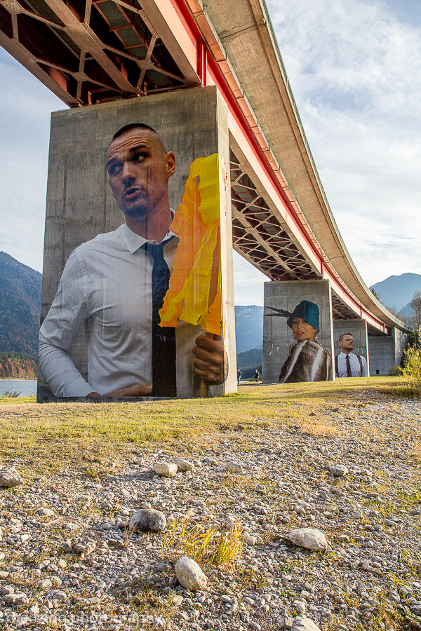 Die Faller-Klamm-Brücke über den Sylvensteinspeicher bei Lenggries. Der Berliner Street-Art-Künstler Sascha Hahn bezeichnet seine temporäre Fotoinstallation „Die Jägerin von Fall“ als eine „neckisch-trashige“ Weiterentwicklung von Ludwig Ganghofers Geschichte „Der Jäger von Fall“.